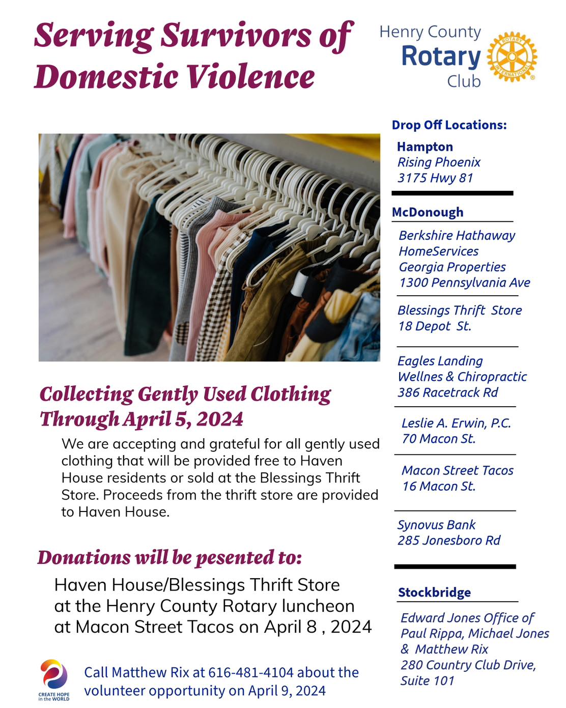 The community came together for this project. There were multiple drop off locations to collect gently used clothing for Blessings Thrift Store that serves Haven House, a home for survivors of domestic violence. There were 10 SUV's packed with clothing and other items delivered to Blessings. In addition several volunteers worked with the Blessings staff in 3 hour shifts to unload and sort items.