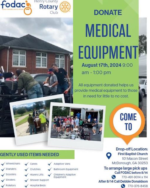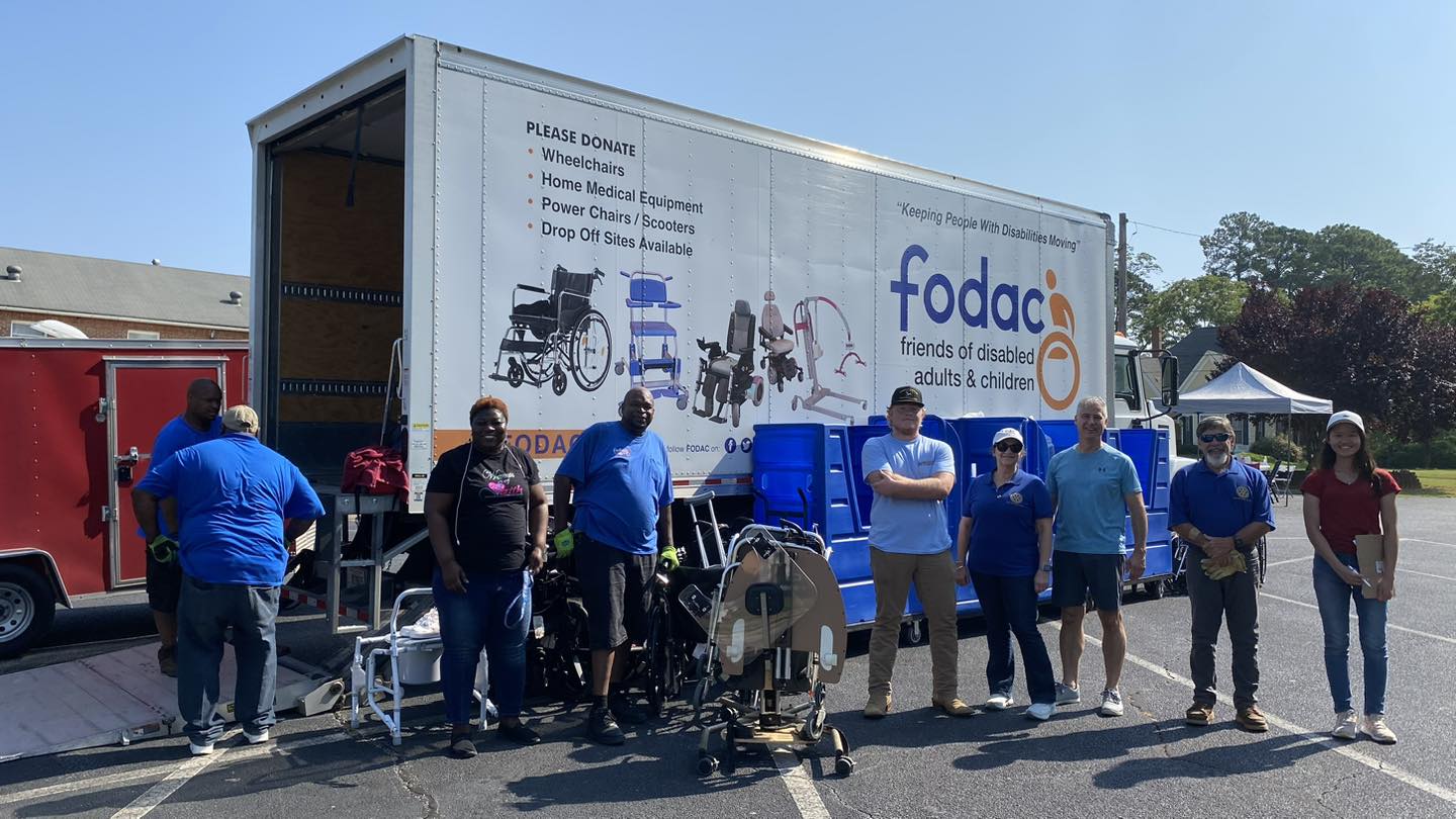 The Club partners with FODAC (Friends of Disabled Adults and Children) to collect used durable medical equipment to be refurbished and then donated to those with disabilities and financial need. Saturday August 17, 2024 donations were collected by club volunteers who picked up equipment from people's homes who could not physically deliver to drop off location.