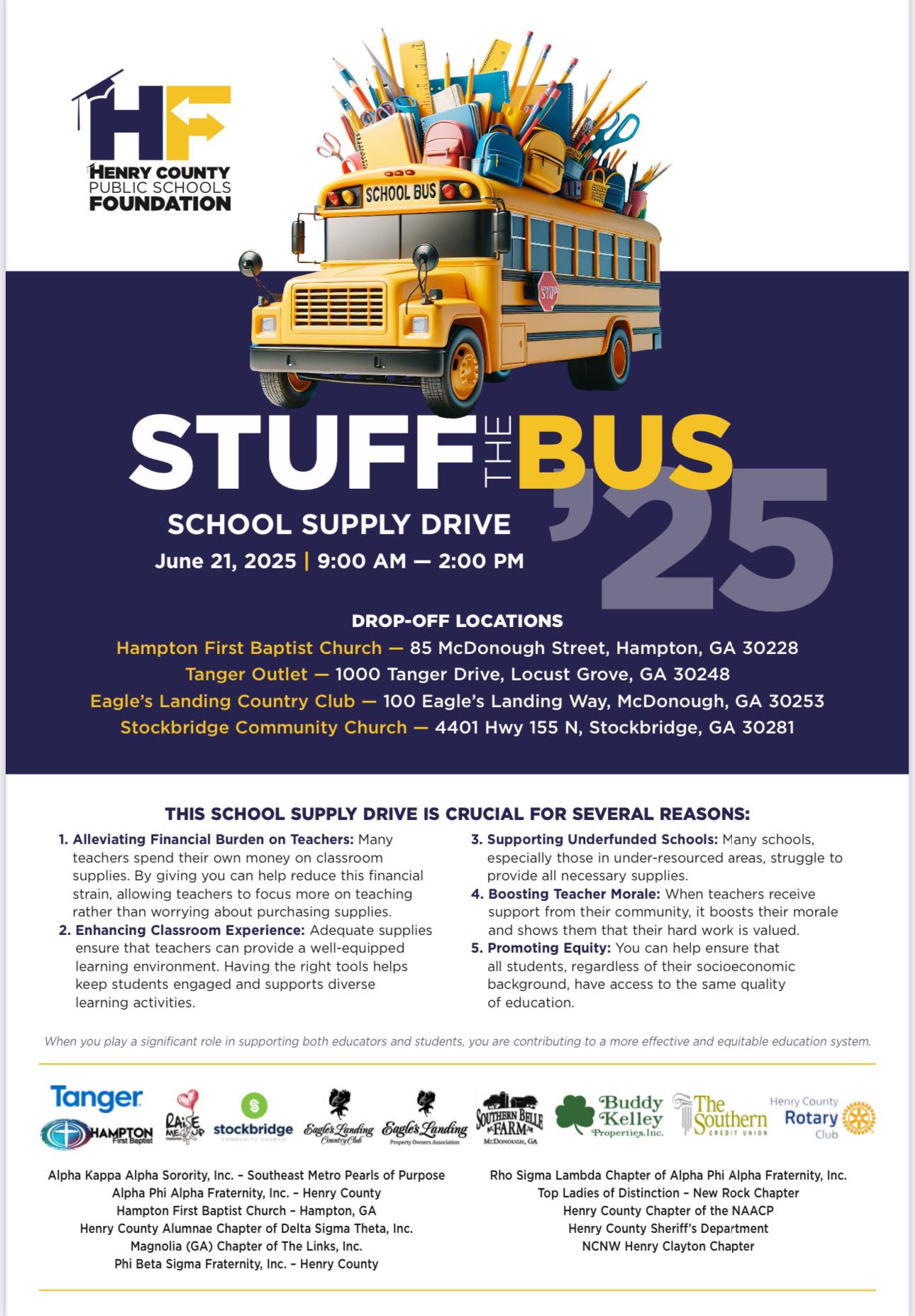 The Stuff The Bus campaign supports more than 2,200 Henry County teachers with supplemental classroom teaching materials along with the 43,000 students in their classrooms who may not have access to the necessary school supplies.